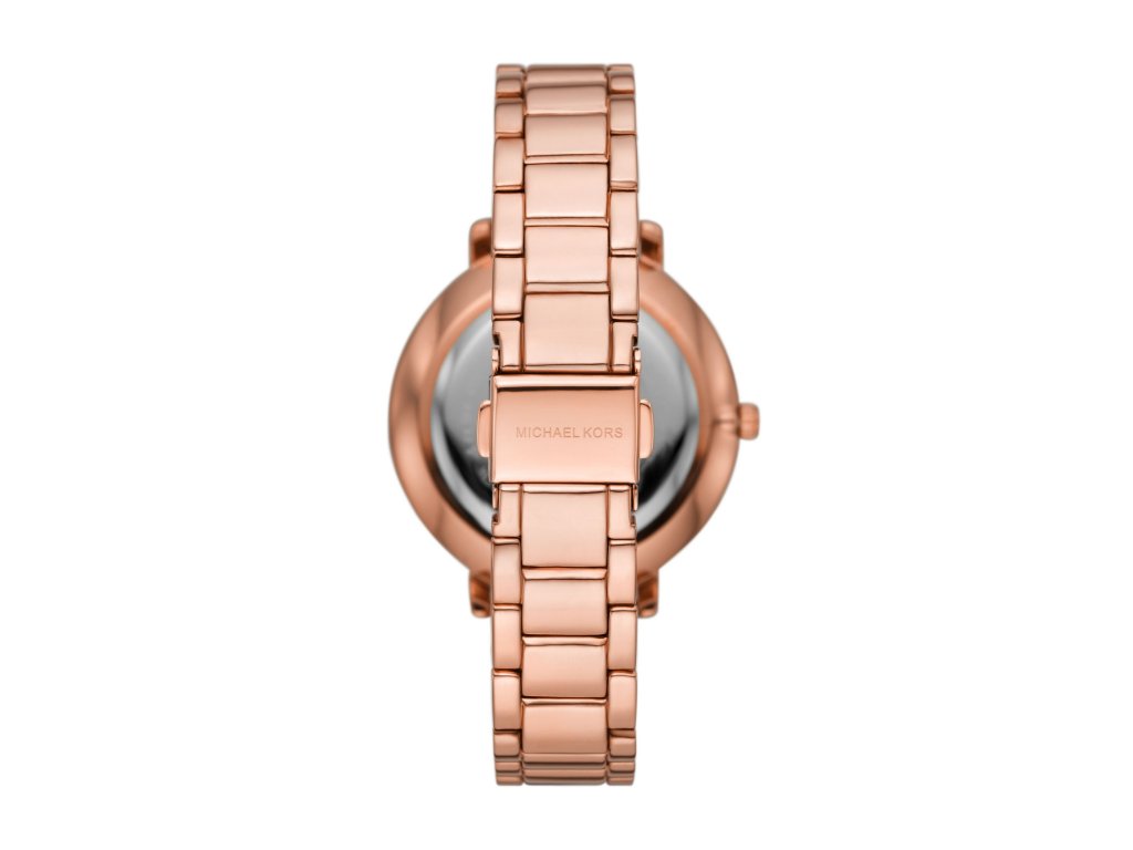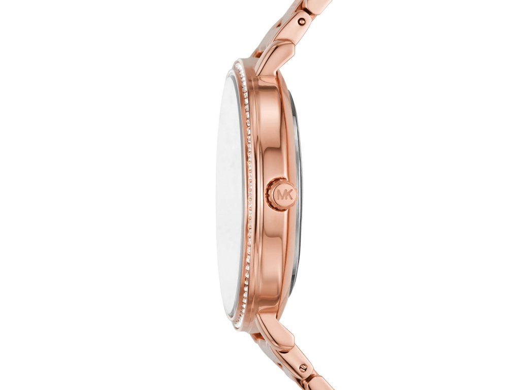 Bílý číselník o průměrů 38 mm s krystaly na místě indexů a logy MK nejenže zajišťuje čitelnost času, ale také dodává hodinkám sofistikovaný a ženský vzhled. Tah z ušlechtilé oceli ve růžovozlaté barvě pak zajišťuje pohodlné a stylové nošení.
