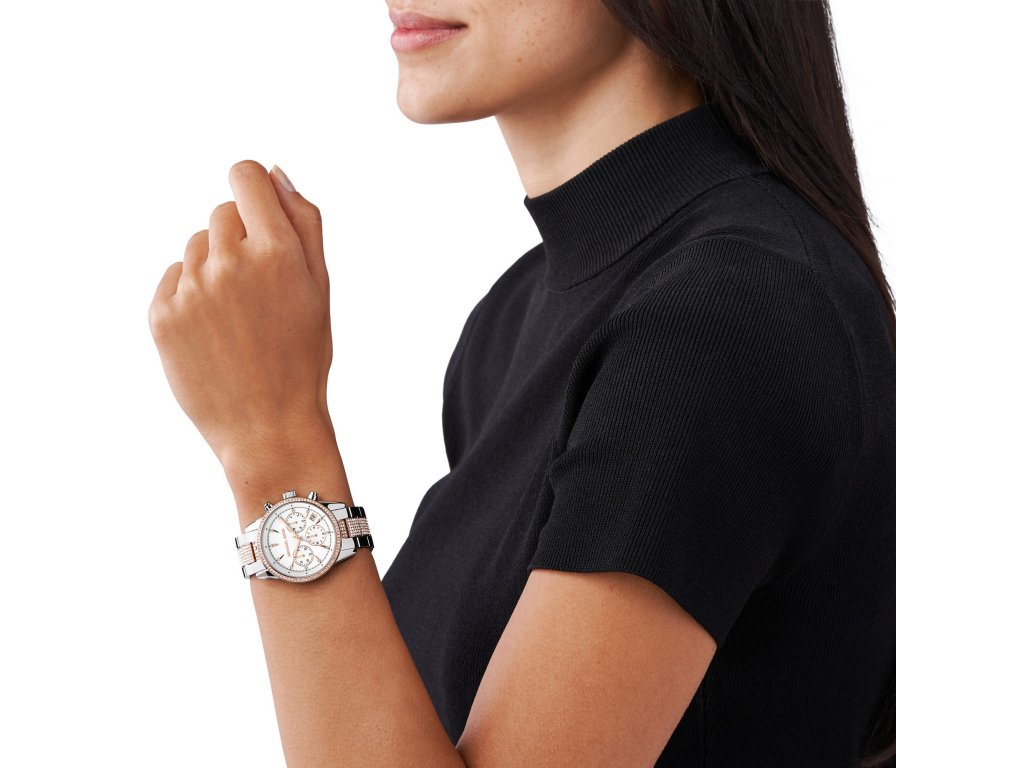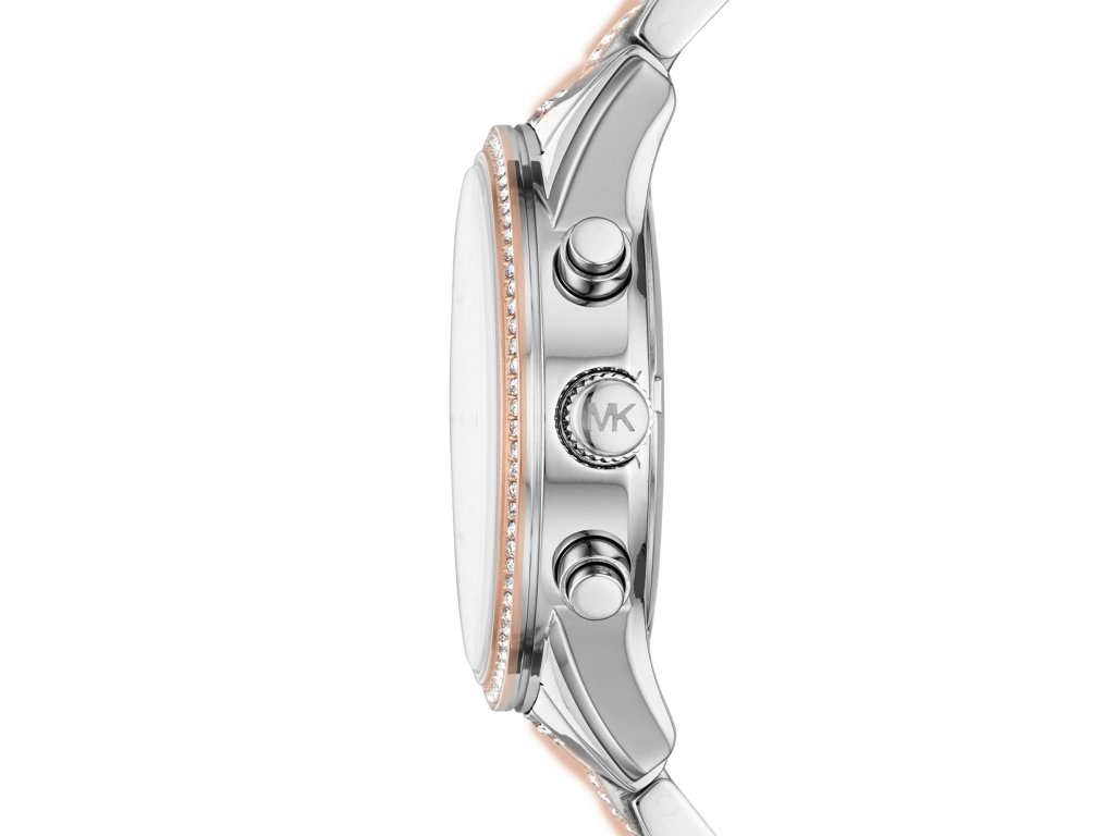 Krystaly na pouzdru, tahu a číselníku vytvářejí nezaměnitelný charakter. Pouzdro a elegantní tah z nerezové oceli v provedení růžovozlatá-stříbrná vytvářejí sofistikovaný vzhled. Bílý číselník je vybaven chronografem, datumovkou a precizními ručkami i indexy.