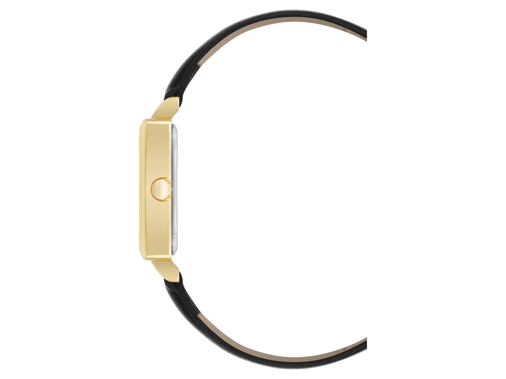 Model pohání přesný strojek Quartz uložený v hranatém pouzdře. Černý řemínek z veganské kůže poskytuje pohodlné nošení a skvěle ladí s výrazným černým číselníkem. Krystaly na číselníku dodávají jemný lesk, díky kterému působí hodinky elegantně a moderně při každodenním použití.