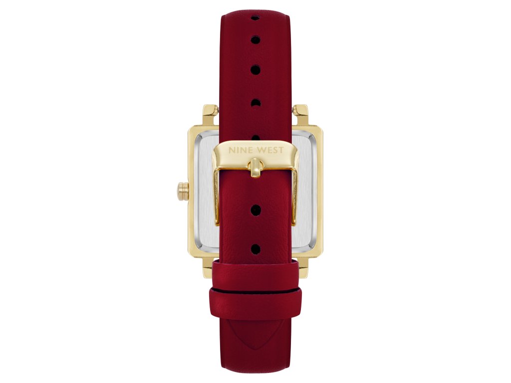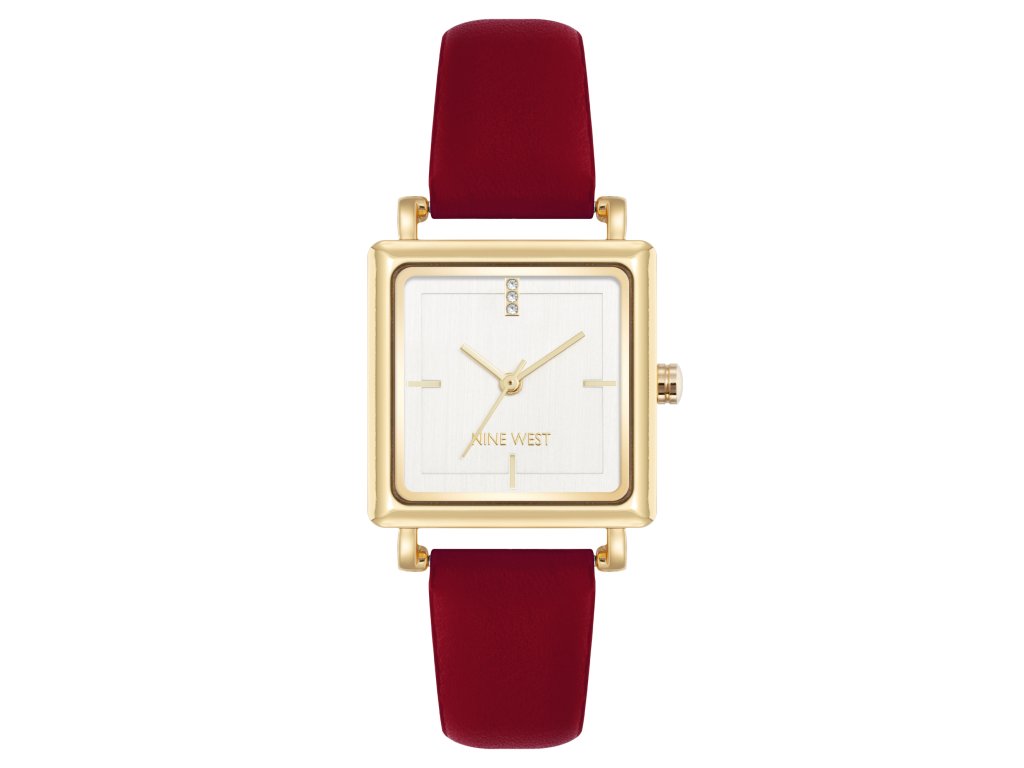Dámské hodinky od značky Nine West zaujmou výraznou, ale přesto elegantní kombinací barev a tvarů. Pozlacené hranaté pouzdro působí moderně a sofistikovaně, zatímco stříbrný číselník ozdobený krystaly dodává jemný lesk. Vínový řemínek z veganské kůže přináší stylovou barevnou hloubku, díky níž hodinky krásně vyniknou na ruce.