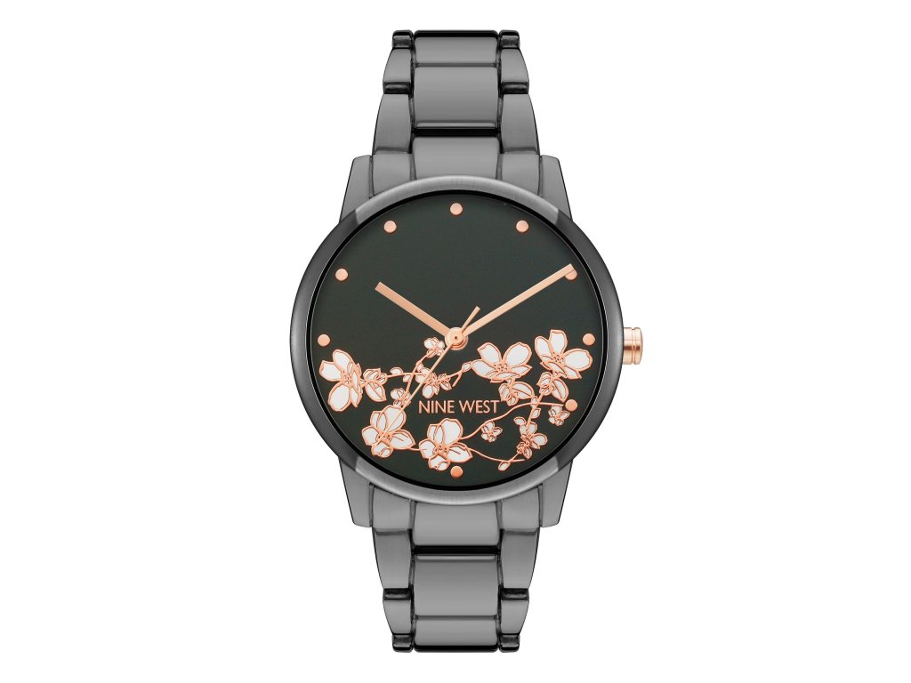Originální květinový motiv na tmavém číselníku dodává hodinkám Nine West jedinečný ženský výraz.