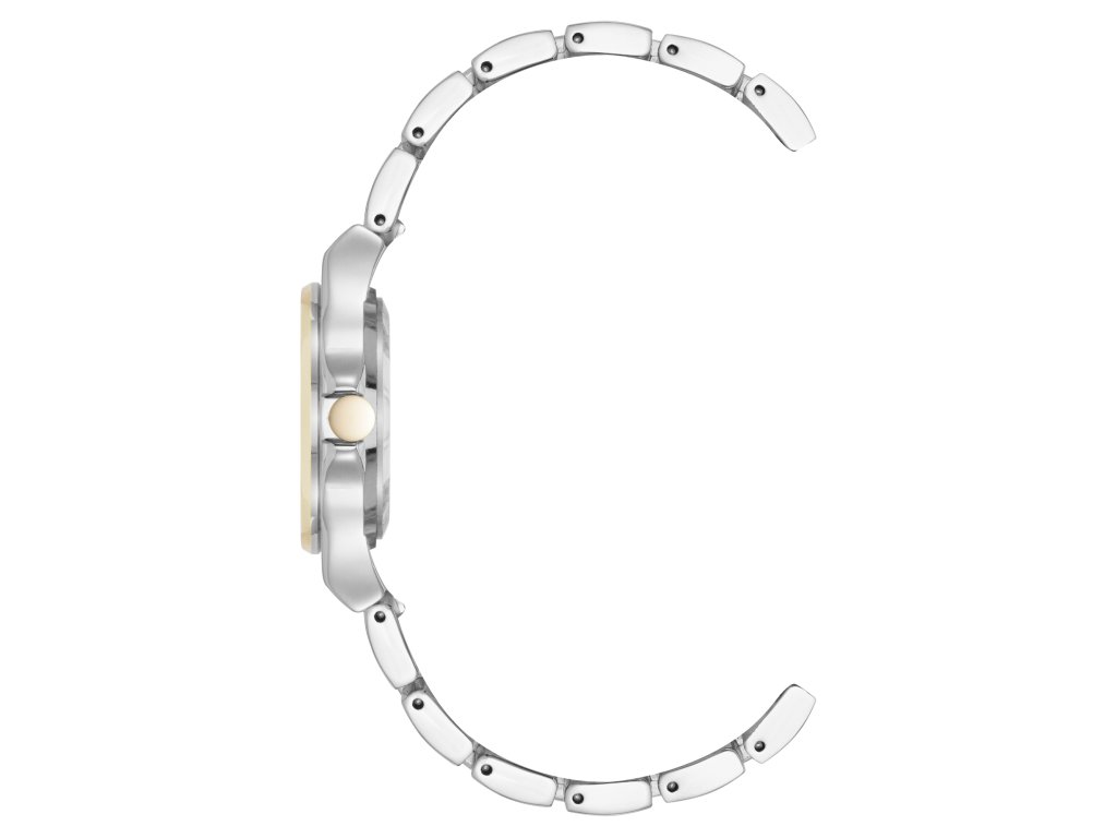 Model pohání přesný strojek Quartz uložený v kulatém pouzdře. Ocelový tah ve stříbrno-zlatém tónu vytváří elegantní kontrast a pohodlně sedí na zápěstí. Bílý číselník podtrhuje celkovou lehkost designu a činí z hodinek univerzální doplněk pro různé příležitosti, od kanceláře až po večerní setkání.