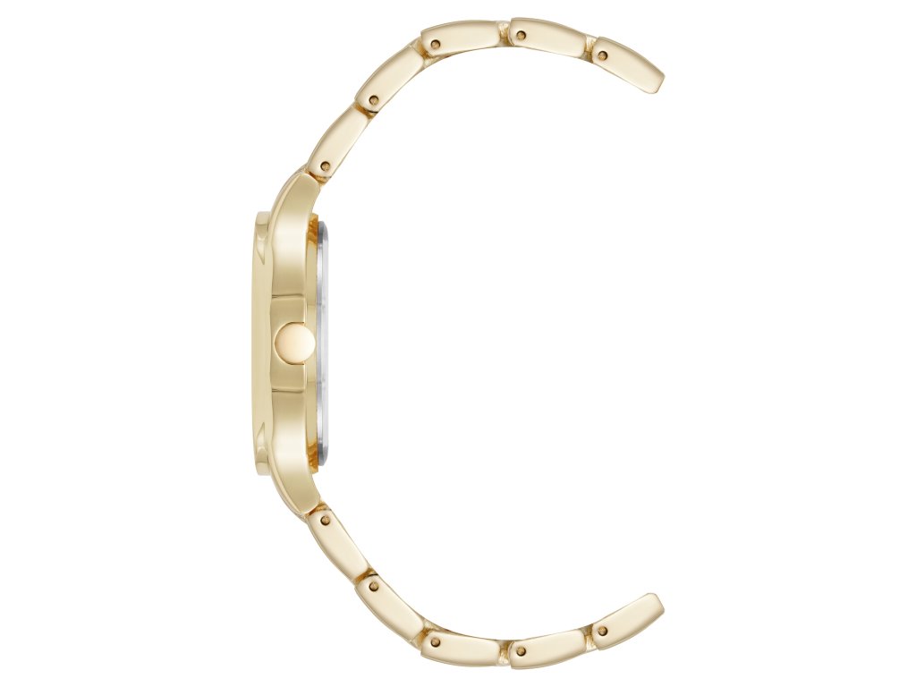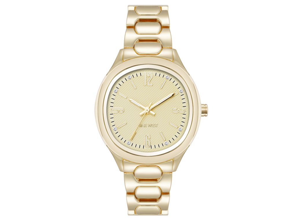 Dámské hodinky od značky Nine West okouzlí sladěným zlatým provedením a šperkovým detailem v podobě krystalů. Kulaté pouzdro ve zlaté barvě působí luxusně a elegantně, zatímco zlatý číselník zdobený krystaly dodává jemný třpyt a ženský šarm.