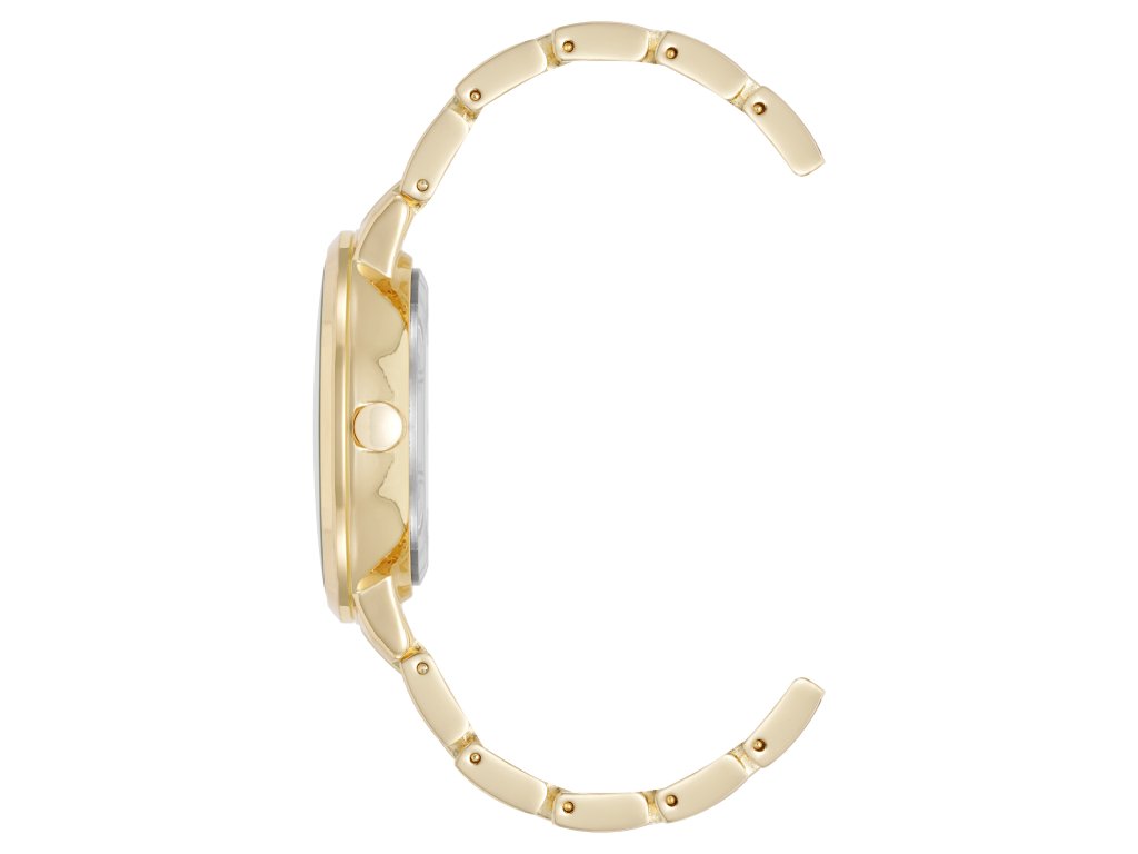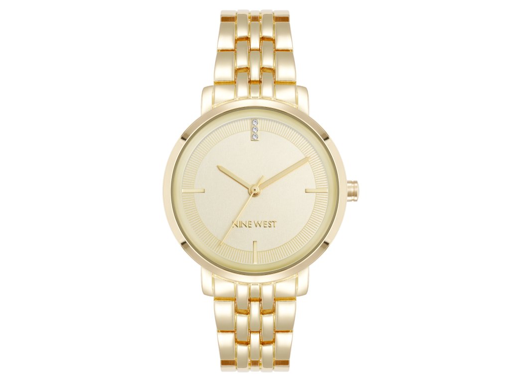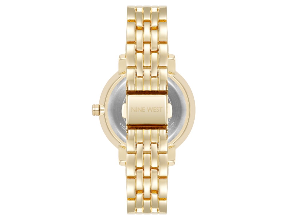Dámské hodinky od značky Nine West okouzlí jednolitým zlatým provedením a elegantním šperkovým vzhledem. Kulaté pouzdro ve zlaté barvě působí nadčasově a luxusně, zatímco číselník zdobený krystaly dodává modelu jemný třpyt. Perfektní volba pro ženy, které chtějí stylový doplněk se zářivým detailem.