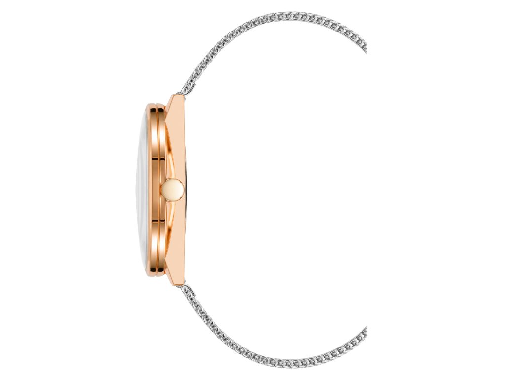 Dámské hodinky s tmavě šedým číselníkem. Hodinky jsou kombinací růžově zlaté a stříbrné. Číselník s čárkovými indexy v růžovo zlaté barvě. Stříbrný perforovaný řemínek dělá z hodinek velice elegantní kousek.Doplňkové parametry