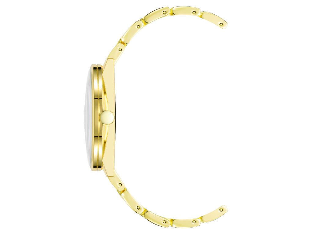 Dámské monochromatické zlaté hodinky s kruhovým číselníkem v matném provedení, který je doplněn o čárkové indexy ve zlaté barvě.Doplňkové parametry