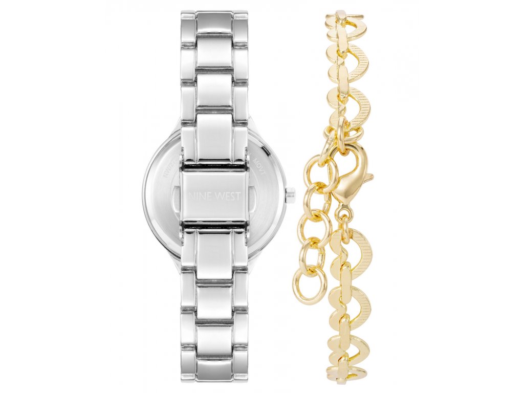 Dámská dárková sada hodinek a náramku. Stříbrné hodinky s číselníkem, který je doplněný o malé třpytivé kamínky a zlaté detaily. Stříbrný číselník s číselnými a čárkovými indexy ve zlaté barvě. Zlatý náramek se srdíčky tvoří s hodinkami ideální kombinaci. Ten pravý dárek pro vaše blízké!Doplňkové parametry