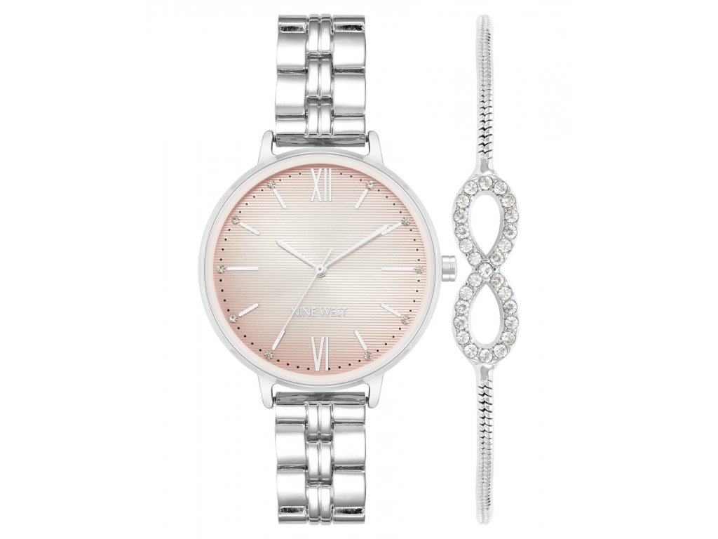 Dámská dárková sada hodinek a náramku. Stříbrné hodinky mají elegantní světle růžový číselník. Číselník s čárkovými indexy a římskýmí číslicemi je doplněn o drobné třpytivé kamínky. Stříbrný náramek s motivem nekonečna tvoří s hodinkami ideální kombinaci. Ten pravý dárek pro vaše blízké!Doplňkové parametry