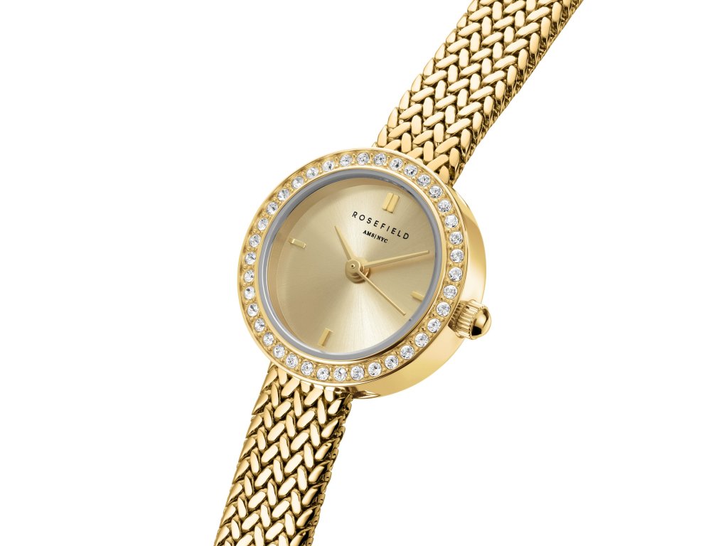 Jemný lesk a moderní elegance – dámské hodinky Mini Small Edit Gold od Rosefield zaujmou luxusním vzhledem díky krystalům osazeným kolem pouzdra. Drobné proporce a precizní detaily tvoří sofistikovaný doplněk pro každou příležitost.