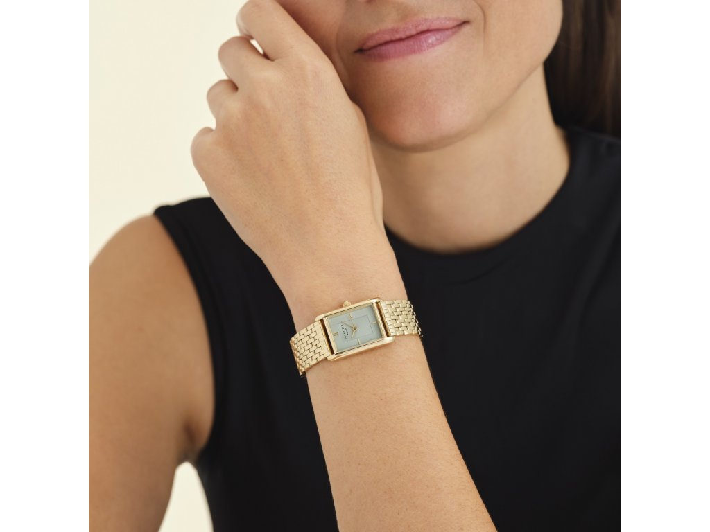 Masivnější obdélníkové pouzdro a jednoduchý design číselníku přidává hodinkám nádech sofistikovanosti. Mini články ocelového tahu ve zlaté barvě dodávají hodinkám ženskou jemnost. Díky svému jednoduchému provedení vypadají hodinky na zápěstí skvěle, ať už zvolíte formální nebo volnočasový outfit.