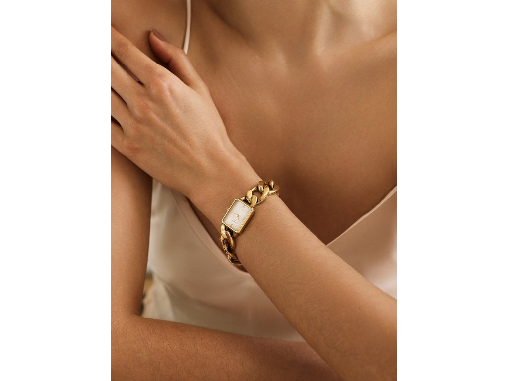 Náramkové hodinky obdélníkového tvaru s bílým číselníkem, doplněny zlatým proplétaným náramkem