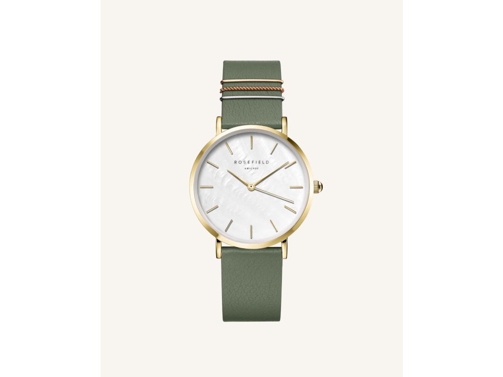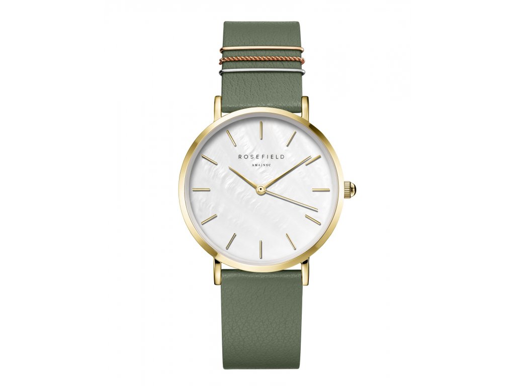 Elegantní náramkové hodinky pro dámy s vytříbeným vkusem, které se nebojí barev-olivově zelený kožený řemínek s doplňky zdobí zlaté hodinky s perleťovým číselníkemDoplňkové parametry