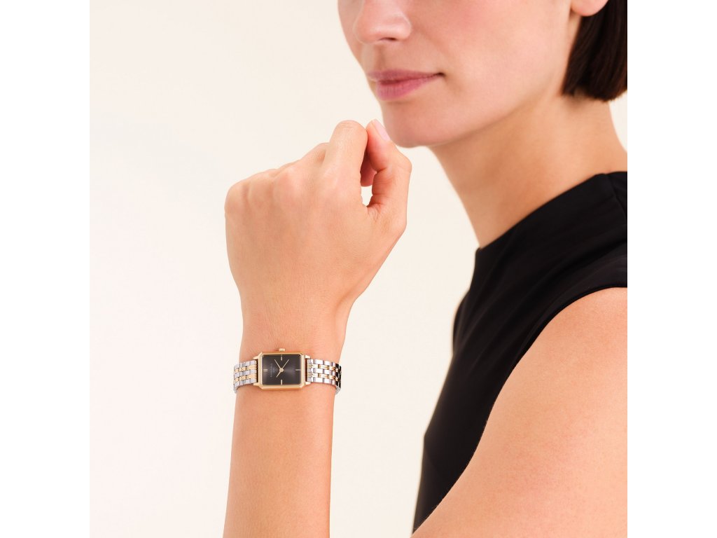 Model zaujme hranatým pouzdrem ve zlaté barvě, které doplňuje elegantní ocelový tah v kombinaci stříbrného a zlatého tónu. Minimalistický černý číselník bez rušivých detailů působí čistě, moderně a sebevědomě.