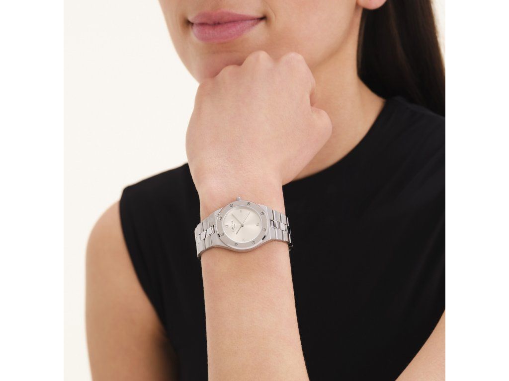Číselník v odstínu creme sunray s minimalistickými římskými číslicemi vytváří jemný světelný efekt, který se mění podle dopadu světla a dodává hodinkám hloubku i živost. Tento typ povrchu působí elegantněji než klasický matný číselník a zároveň zůstává velmi dobře čitelný.