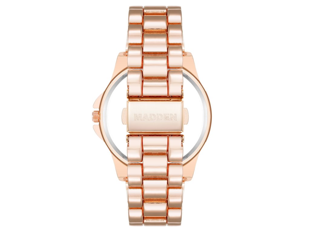 Dámské hodinky od značky Steve Madden v sobě spojují jemný luxus, ženskou eleganci a moderní třpyt. Jednotná růžovozlatá barva doplněná krystaly na číselníku i pouzdře vytváří efekt zářivého šperku, který zvýrazní každý outfit a dodá mu jemnou sofistikovanost.