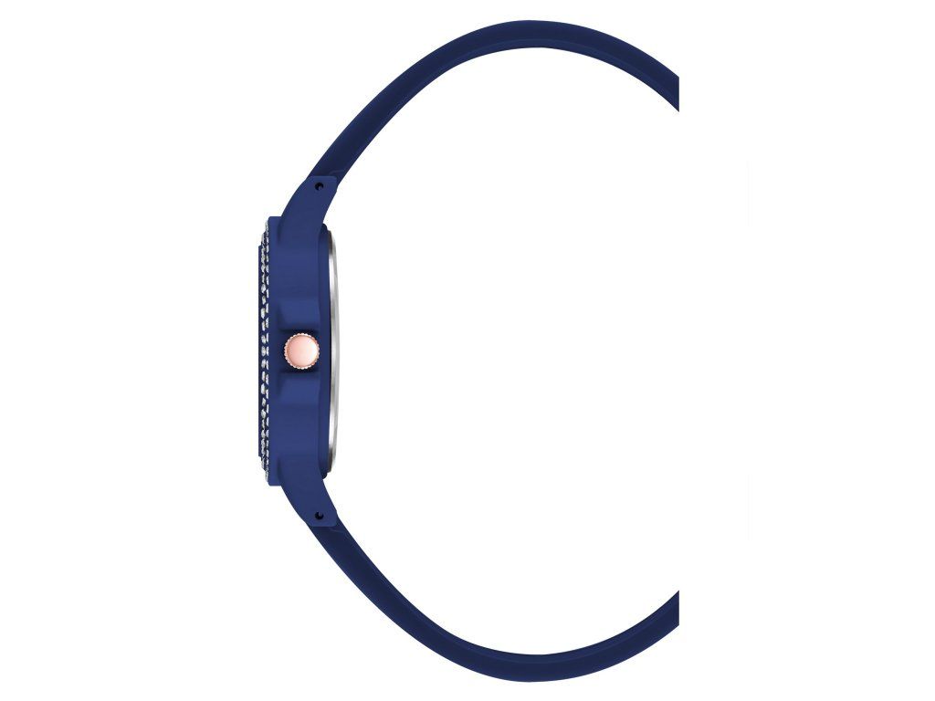 Silikonový řemínek v modré barvě zajišťuje pohodlné nošení a podtrhuje sportovně-moderní charakter modelu. Kulaté pouzdro v modrém tónu zdobené krystaly harmonicky navazuje na číselník ve stejném barevném ladění a vytváří výrazně sladěný celek. Model je vybaven spolehlivým strojkem Quartz.