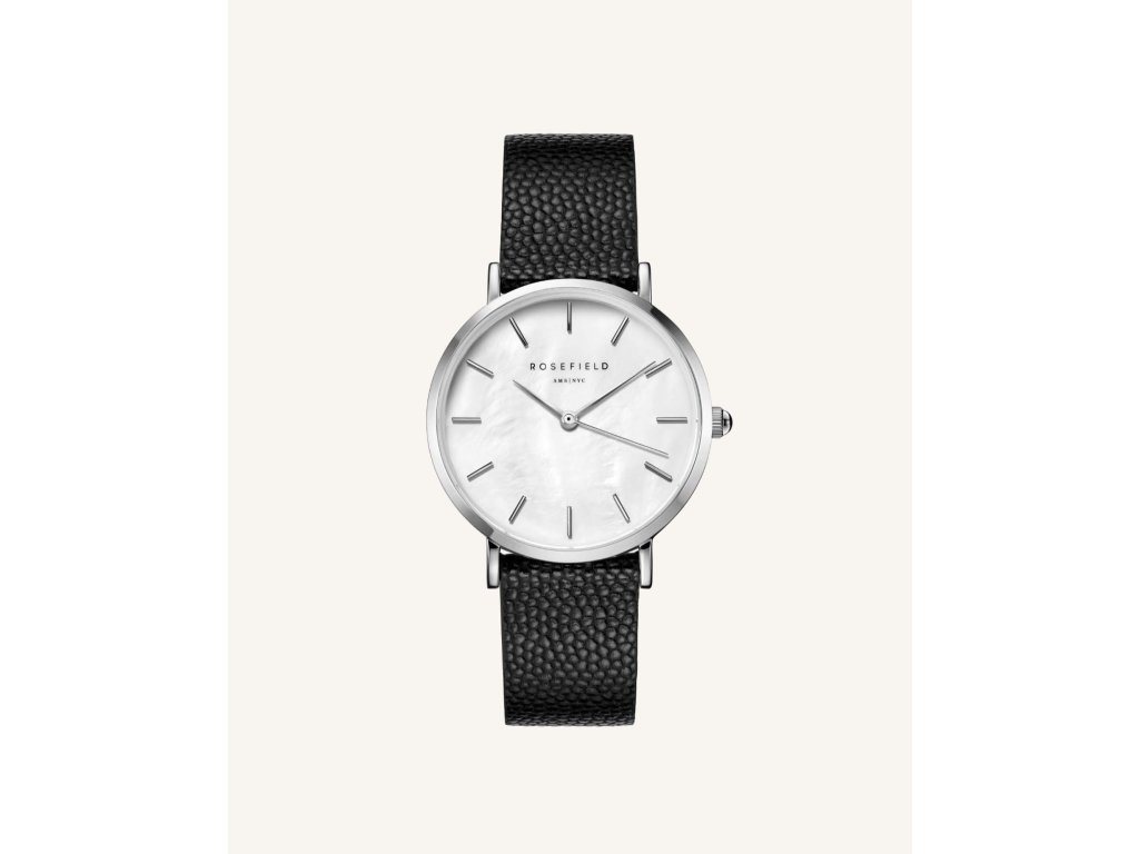 Černý kožený řemínek doplňuje klasické stříbrné hodinky s perleťovým číselníkemDoplňkové parametry