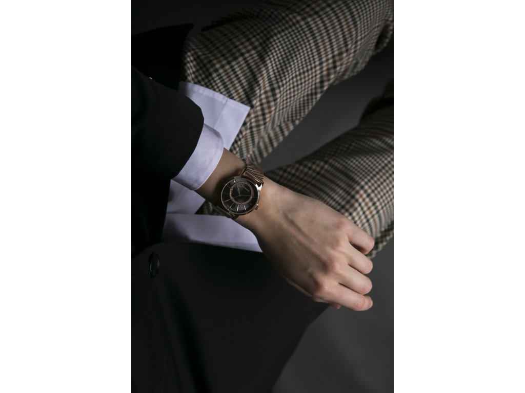 Dámské hodinky s pouzdrem v barvě růžového zlata, s páskem v růžovo-zlatém meshi a výrazným černým číselníkem, který je zdobený skleněnými kamínky.Doplňkové parametry