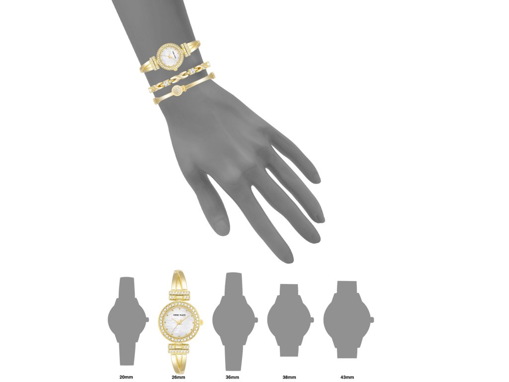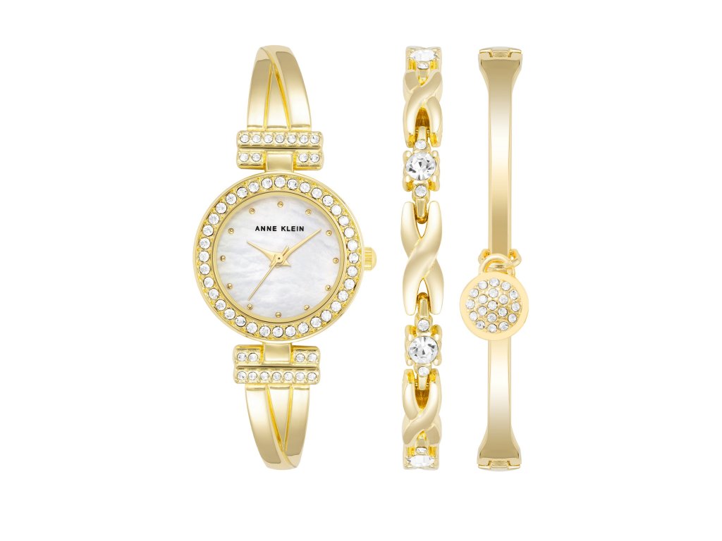 Dámské náramkové hodinky. Pouzdro je z obecného kovu bez obsahu niklu v barvě žlutého zlata. Číselník je bílý perleťový. Lunetu zdobí krystaly. Náramek je též z obecnéh kovu bez obsahu niklu. Spolu s hodinkami najdete v krabičce 2 náramky téhož provedení. Náramky jsou zdobeny krystaly. Vodotěsnost 30M.Doplňkové parametry