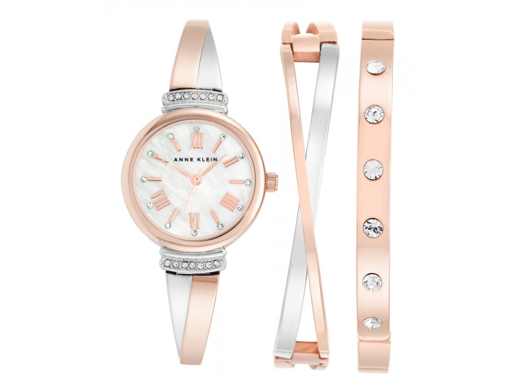 Dámské náramkové hodinky. Pouzdro hodinek je z obecného kovu bez obsahu niklu v barvě bicoloru - řůžového zlata a stříbra. Hodinky zdobí luneta v provedení růžového zlata a číselník je bílé perleťové barvy. Spolu s hodinkami jsou v balení 2 náramky, rovněž z obedného kovu bez obsahu niklu v barvě bikolor, růžového zlata a stříbra. Vodotěsnost 30M.Doplňkové parametry
