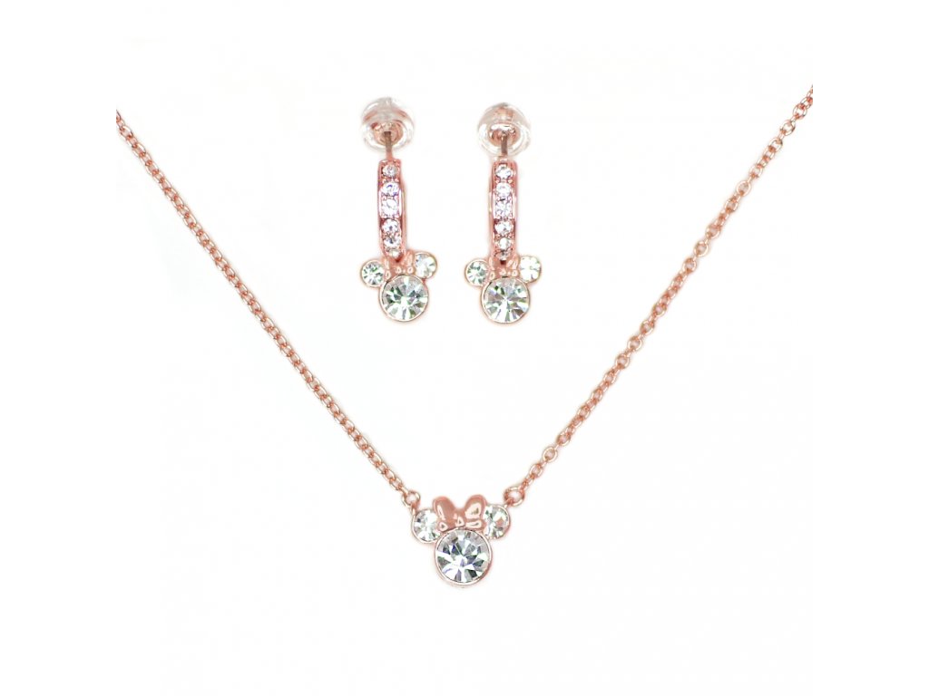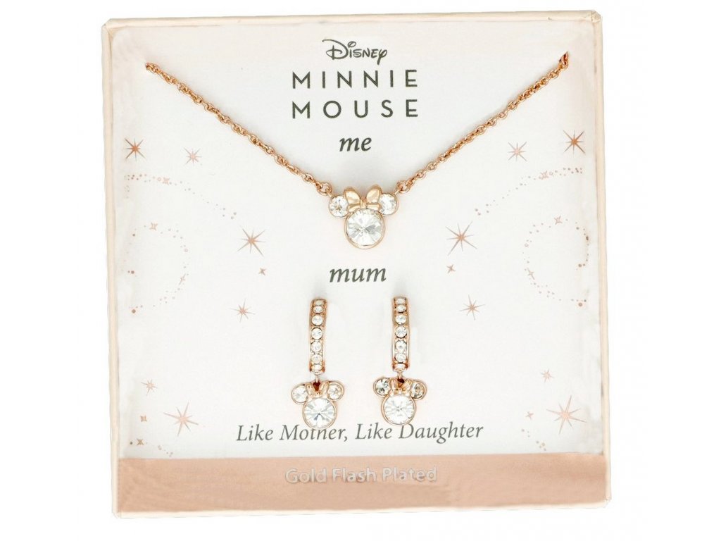 Dárkový set od Disney je vysněným šperkem pro každou milovnici Minnie Mouse. Set se skládá z řetízkového náhrdelníku s přívěskem Minnie a kruhových náušnic s ikonickou siluetou myšky s mašlí. Přívěsek i náušnice jsou osazeny kubickou zirkonií, což šperkům dodává luxusní vzhled.