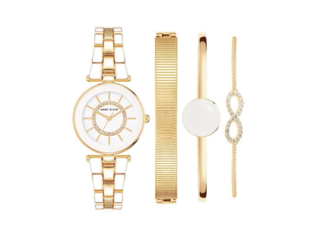 Řemínek i pouzdro hodinek a náramky jsou vyrobeny z bezniklové slitiny kovu zlatavé barvy. Pouzdro o velikosti 28 x 34 mm a síle 6,9 mm, do něhož je vsazen kulatý číselník lesklé bílé barvy, jemuž dominují moderní zlatavé indexy, útlé ručičky a krystaly lemující střed číselníku působí luxusně. Velmi pěkně také vypadá černé logo značky Anne Klein prakticky umístěné v horním středu číselníku. Celou sadu poté tvoří náramek se symbolem nekonečna s krystaly, doplněk s bílým středovým smaltovým dílem a šperk se zlatavou texturou. Dohromady jsou tyto šperky zdobeny 59 krystaly. Spojení všech těchto doplňků tak vypadá jednoduše skvostně.