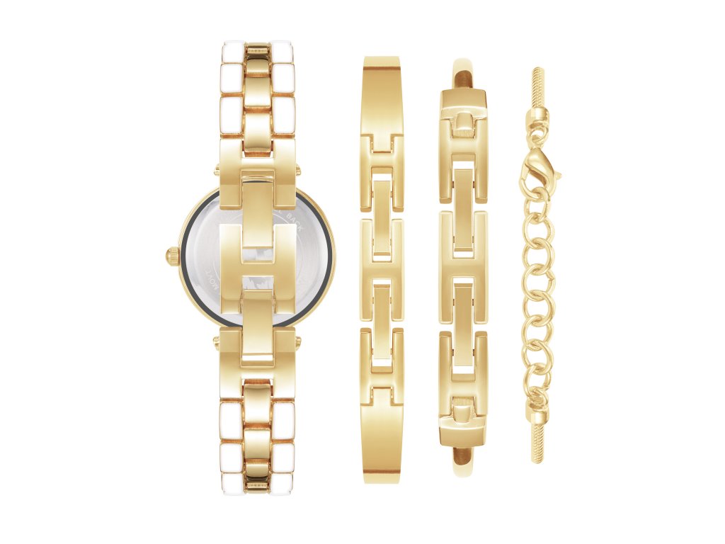 Zvolte eleganci a udělejte dojem všude, kam půjdete. Se setem značky Anne Klein, v němž se nacházejí sofistikované zlatavé hodinky zlatavé barvy a tři okouzlující náramky to půjde snadno. Jednotlivé doplňky můžete kombinovat a dát tak najevo svůj jedinečný styl, nebo lze každý kousek nosit zvlášť. Skvěle se hodí ke kostýmkům do práce, na pracovní jednání, ale i do společnosti k šatům.