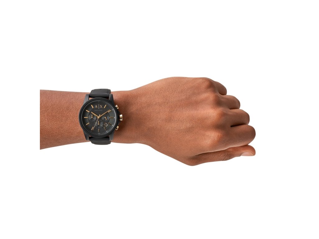 Set doplňků, který vyladí váš styl doma I na cestách, to jsou hodinky Outerbanks, ve kterých ladí černo-zlatý kontrast, a řemínek na zavazadla od Armani Exhange.