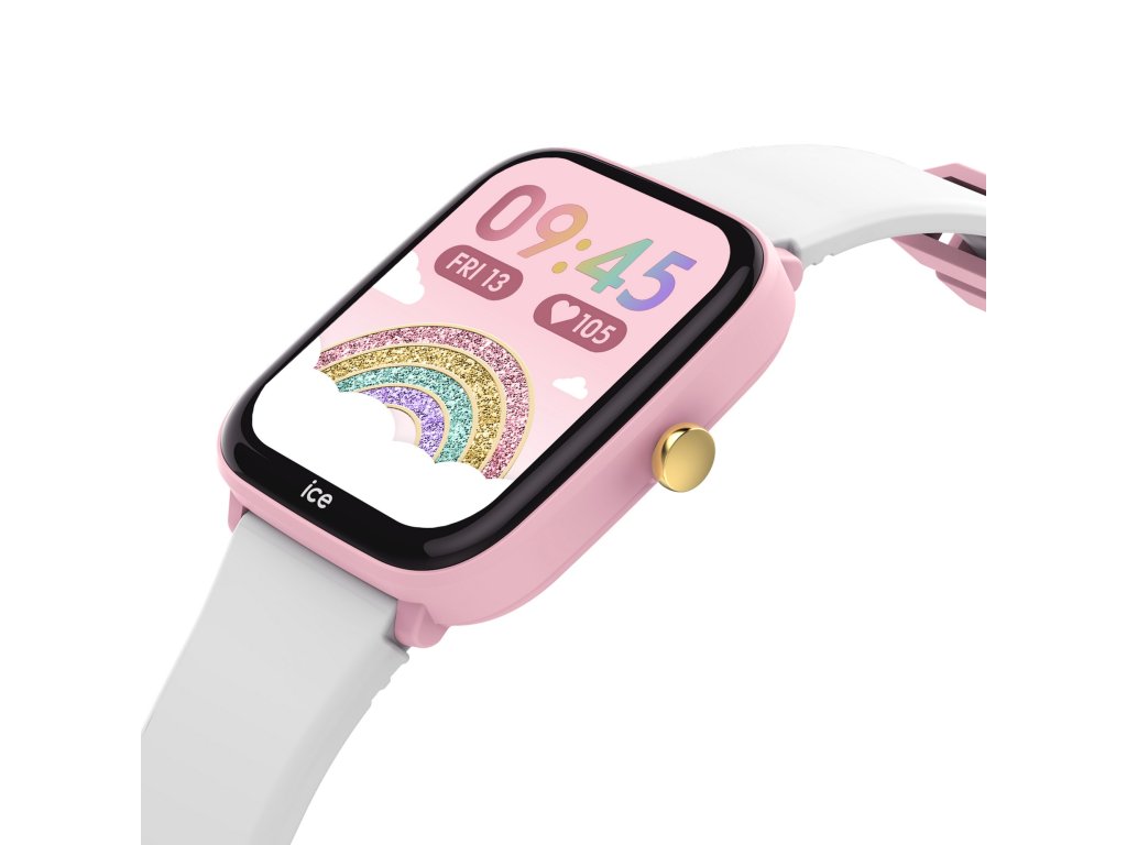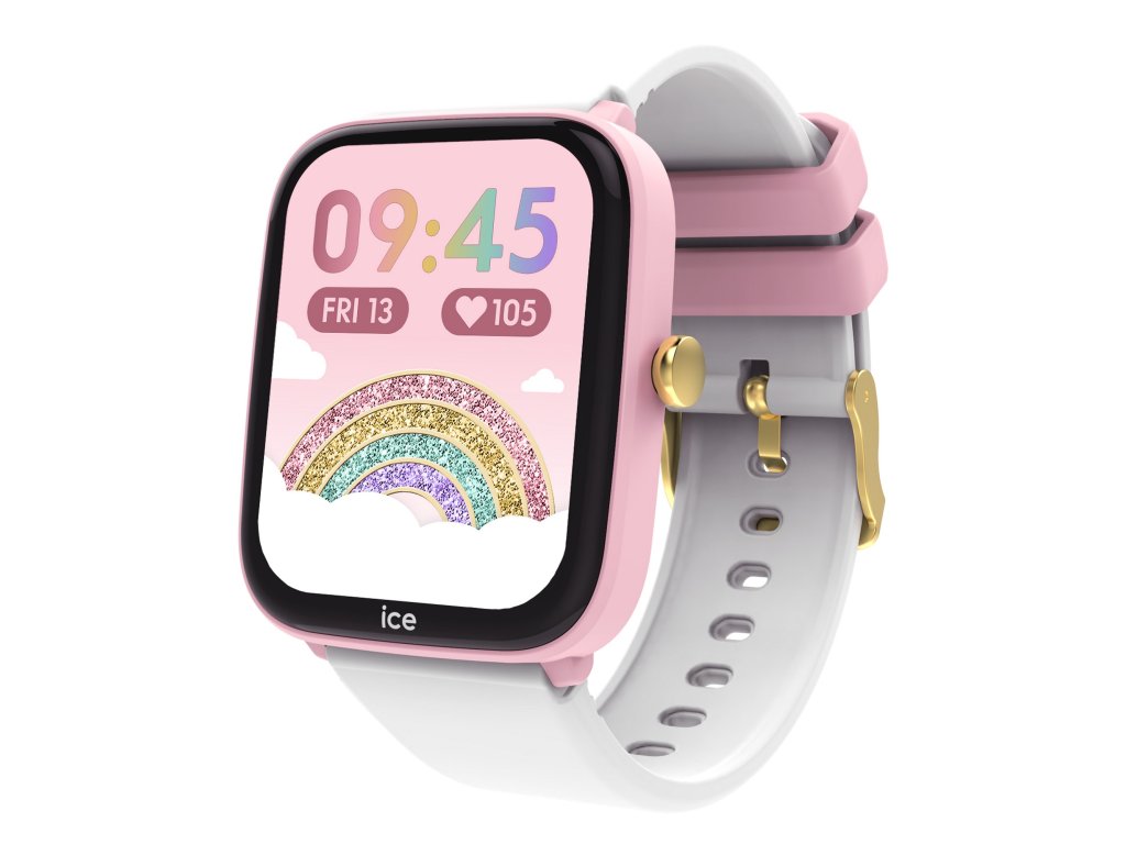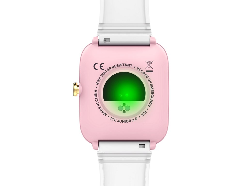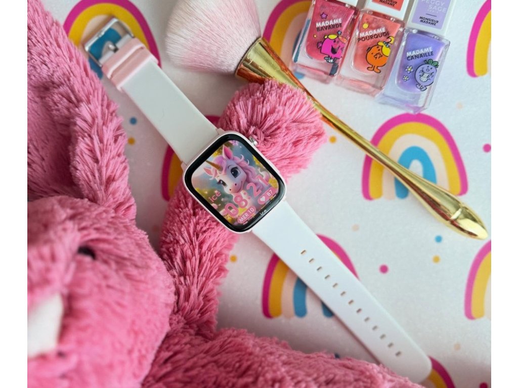 Tyto stylové hodinky v jemné kombinaci bílé a růžové barvy mají lehké hranaté pouzdro z plastu a pohodlný silikonový řemínek, který perfektně sedí na dětském zápěstí. 1,75” barevný displej s rozlišením 240 × 296 px a úhlopříčkou 44 mm je jasný, dobře čitelný a skvěle zobrazuje všechny funkce.