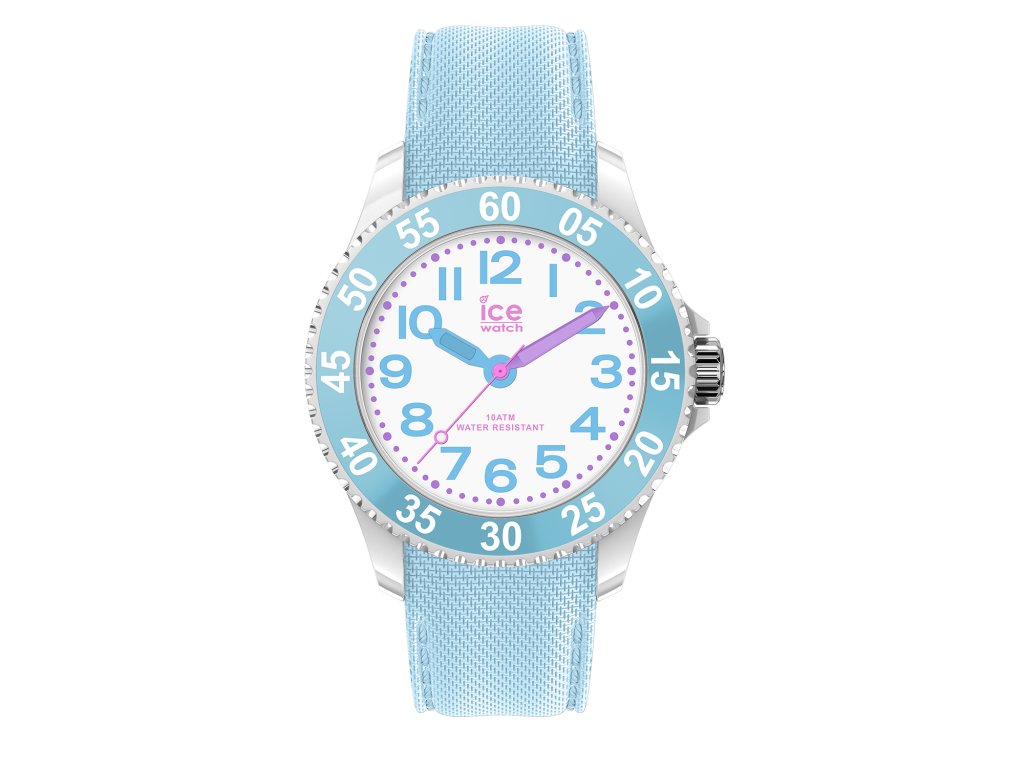 Dětské hodinky Ice Watch s číselníkem ve světle modré barvě zdobeným modrými arabskými číslicemi a barevnými ručkami s vteřinovou ručičkou, uloženým v modrostříbrném pouzdře s indexy pro odečítání vteřin a světle modrým řemínkem.Doplňkové parametry