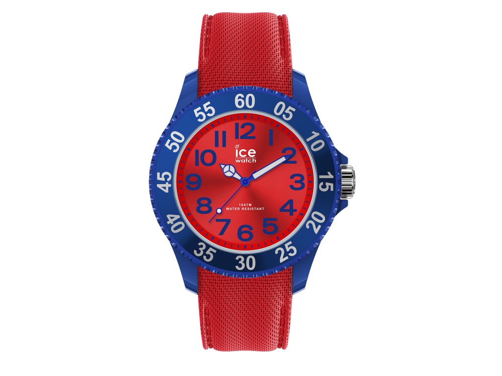 Dětské hodinky Ice Watch s číselníkem v červené barvě zdobeným modrými arabskými číslicemi a bílými ručkami s vteřinovou ručičkou, uloženým v modrém pouzdře s indexy pro odečítání vteřin a červeným řemínkem.Doplňkové parametry