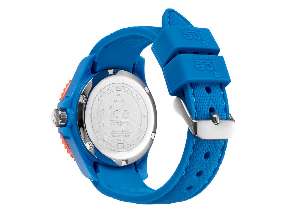 Dětské hodinky Ice Watch s číselníkem v modré barvě zdobeným červenými arabskými číslicemi a bílými ručkami s vteřinovou ručičkou, uloženým v modrém pouzdře s indexy pro odečítání vteřin a modrým řemínkem.Doplňkové parametry