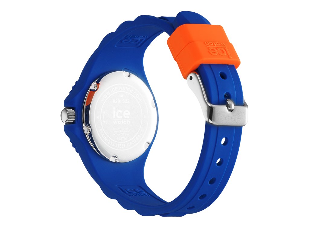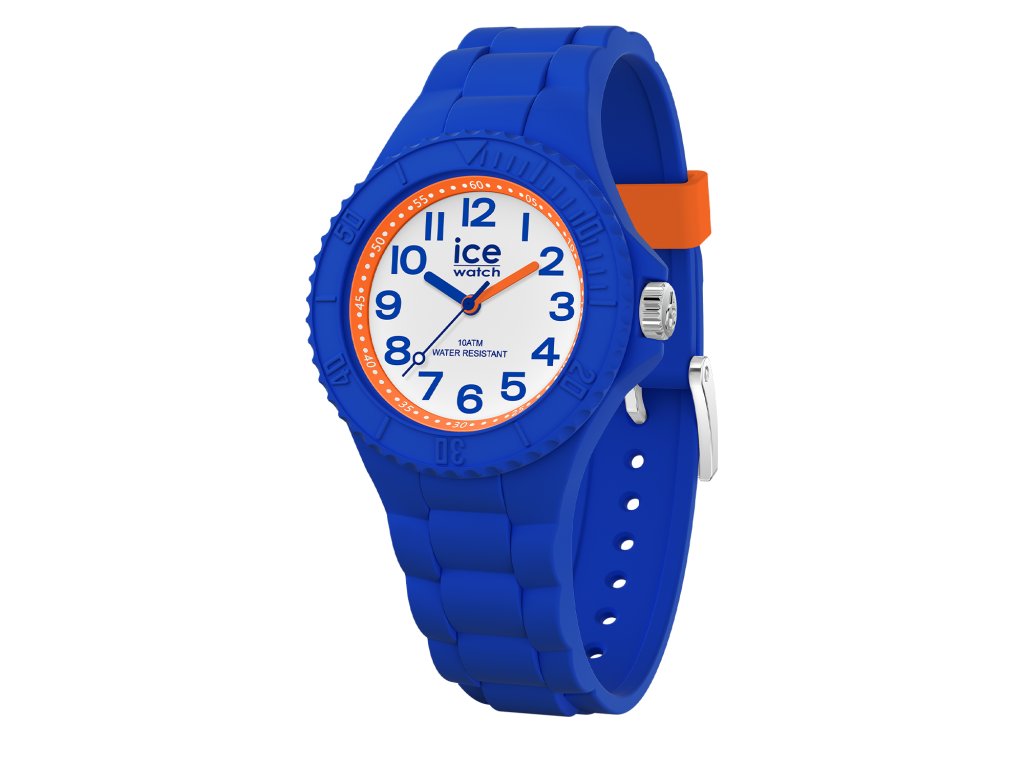 Dětské hodinky Ice Watch s číselníkem v bílé barvě zdobeným oranžovým orámováním a modrými arabskými číslicemi a barevnými ručkami s vteřinovou ručičkou, uloženým v modrém pouzdře s indexy pro odečítání vteřin a modrým řemínkem.Doplňkové parametry