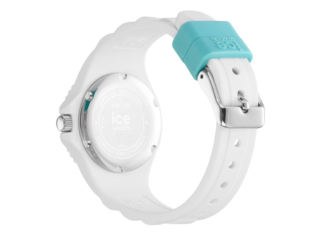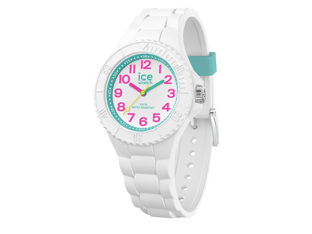 Dětské hodinky Ice Watch s číselníkem v bílé barvě zdobeným zeleným orámováním a růžovými arabskými číslicemi a barevnými ručkami s vteřinovou ručičkou, uloženým v bílém pouzdře s indexy pro odečítání vteřin a bílým řemínkem.Doplňkové parametry