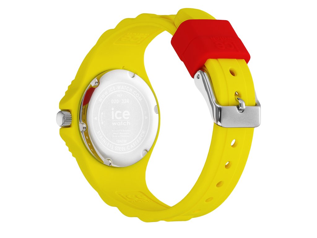 Dětské hodinky Ice Watch s číselníkem v bílé barvě zdobeným červeným orámováním a modrými arabskými číslicemi a barevnými ručkami s vteřinovou ručičkou, uloženým v modrozeleném pouzdře s indexy pro odečítání vteřin a žlutým řemínkem.Doplňkové parametry
