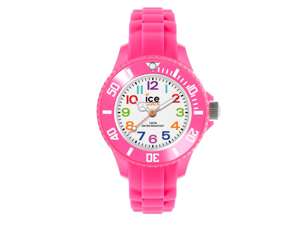 Dětské hodinky Ice Watch s číselníkem v bílé barvě zdobeným barevnými číslicemi a barevnou vteřinovou ručičkou, uloženým v růžovém pouzdře s indexy pro odečítání vteřin.Doplňkové parametry