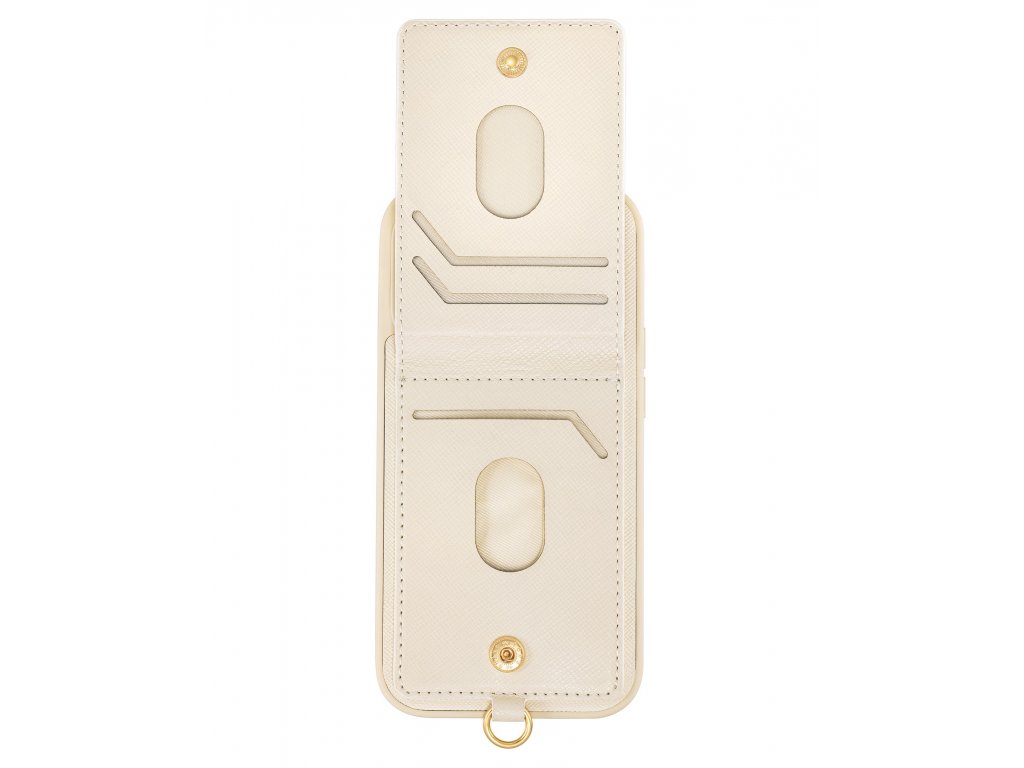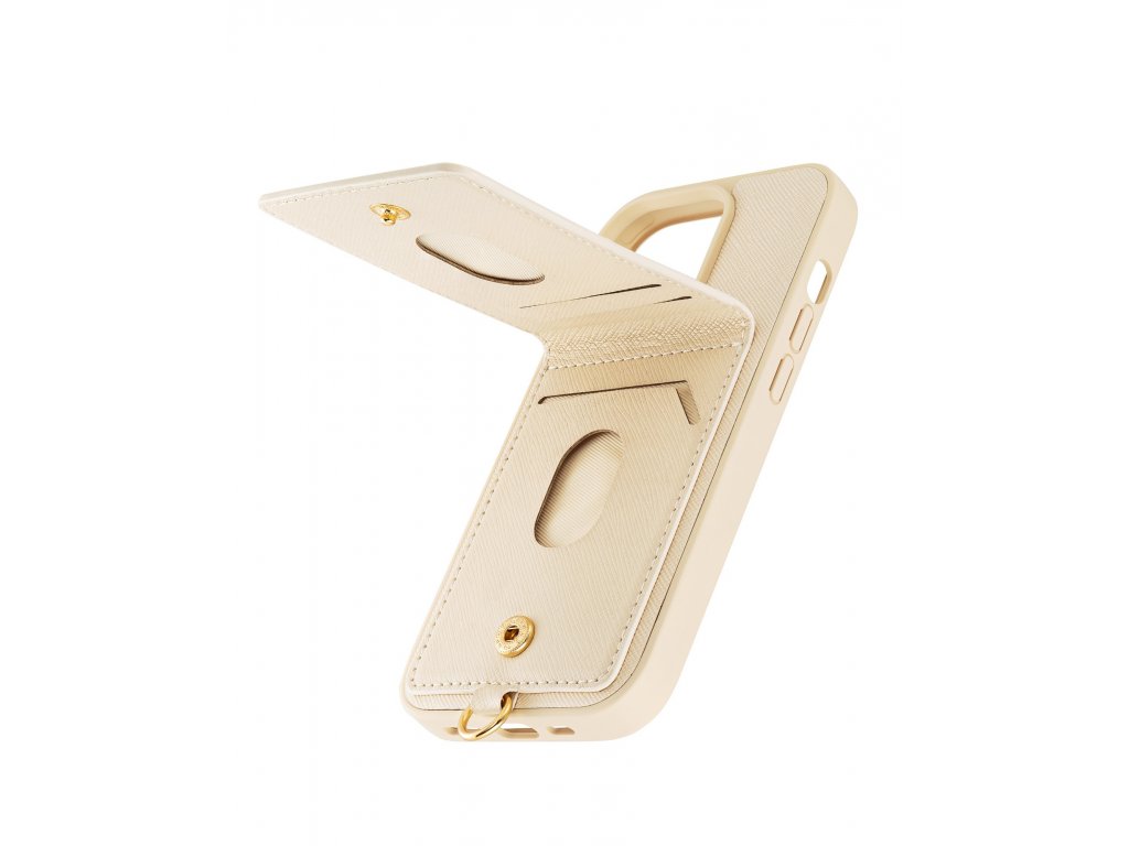 Vyroben je z vysoce kvalitní veganské kůže s luxusní texturou saffiano. Provedení v krémové barvě slonovinového odstínu a zlaté detaily mu přidávájí dotek jemné elegance a sofistikovanosti.