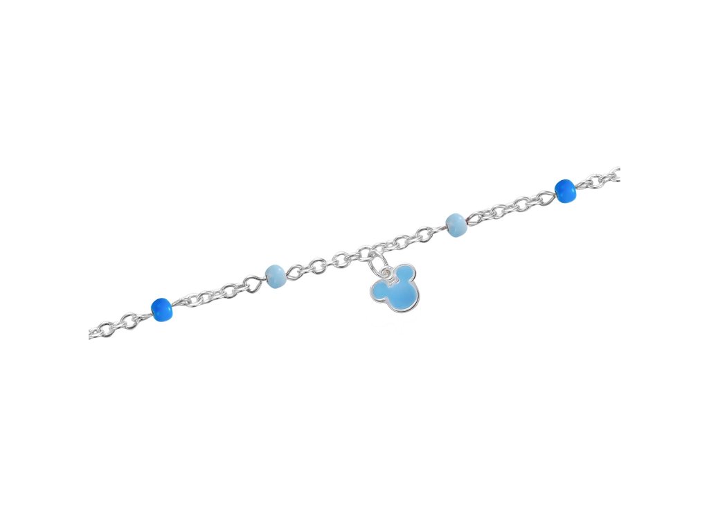 This bracelet is made of silver. It is decorated with a detailed Mickey Maus pendant. The precisely applied blue enamel gives the jewel a playfulness that will enchant every little girl. The bracelet is complemented with small beads of light blue and dark blue, which emphasize the elegant look and add to the bracelet's playfulness. The glossy finish enhances the details and makes the jewel even more attractive.