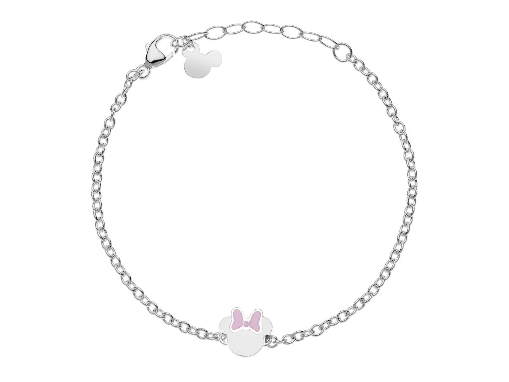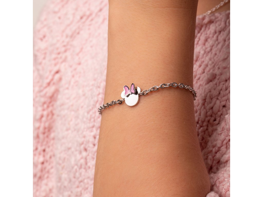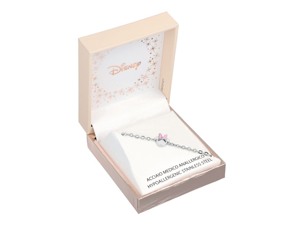 This bracelet with a Minnie Mouse head decoration from Disney is made of stainless steel with a glossy finish. The head of the mouse is decorated with white enamel, the bow with pink, which together with the colour of the steel creates a tender combination. The maximum length of the bracelet is 17 cm. It comes in a stylish box.