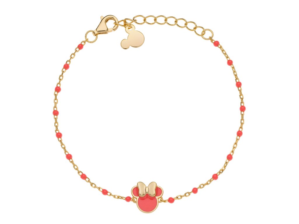 Gold-plated silver children's bracelet with dark pink beads and a Minnie Mouse head charm will delight all young fans of the iconic Disney character. The dark pink enamel highlights the characteristic bow and perfectly complements the colourful beads. The dark pink enamel highlights the characteristic bow and perfectly complements the colourful beads.