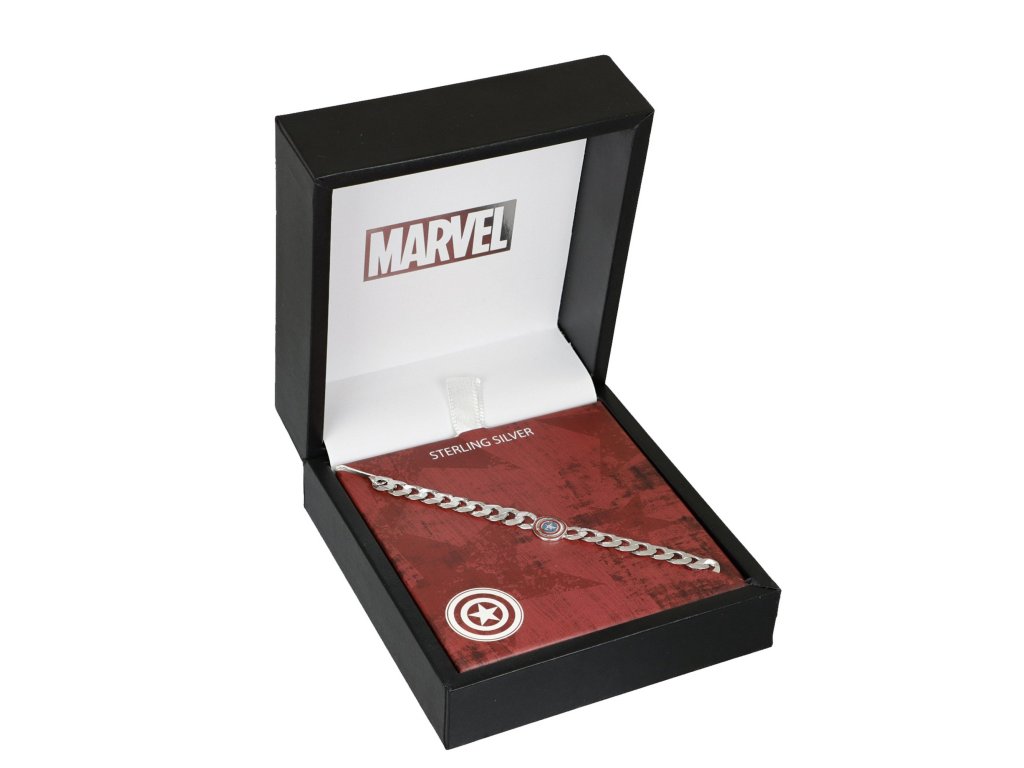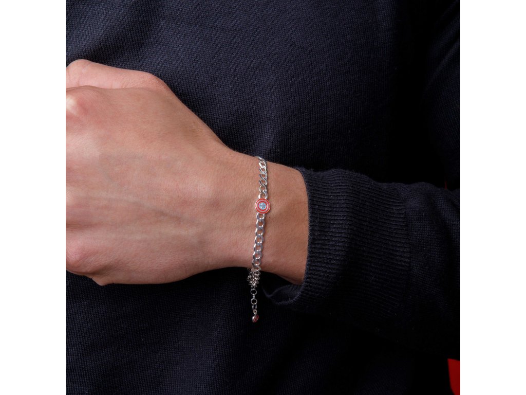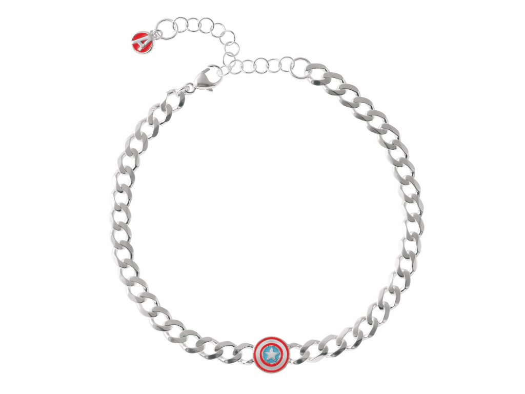 The chain bracelet composed of large loops is made of sterling silver 925/1000. The Captain America shield-shaped ornament is decorated with blue and red enamel. The Avengers logo is also decorated with red enamel at the end of the adjuster.