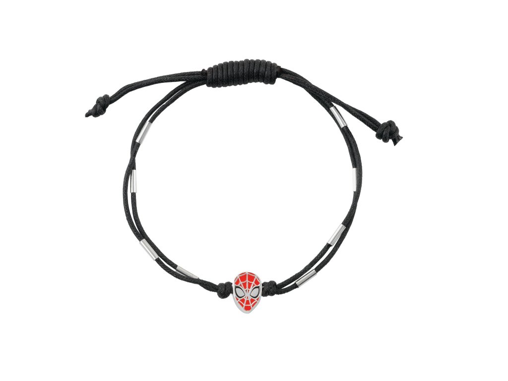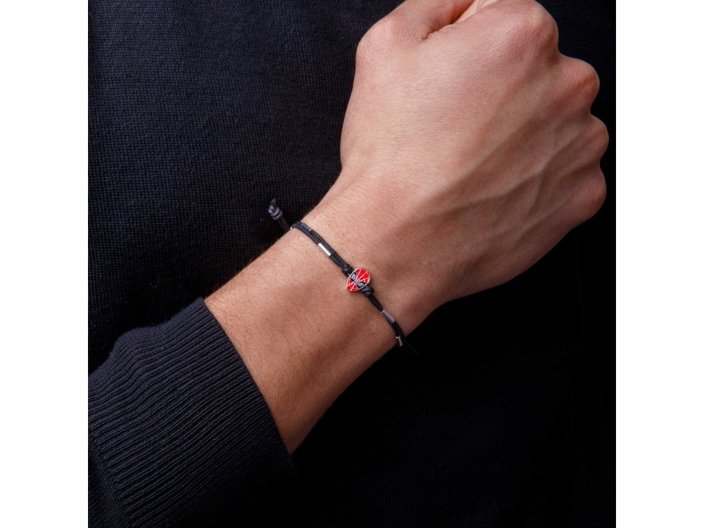 The combination of double black fabric and silver elements with 925/1000 purity, creates a slightly shiny design, the center is decorated with the head of the superhero Spider-Man and is decorated with red and black enamel.