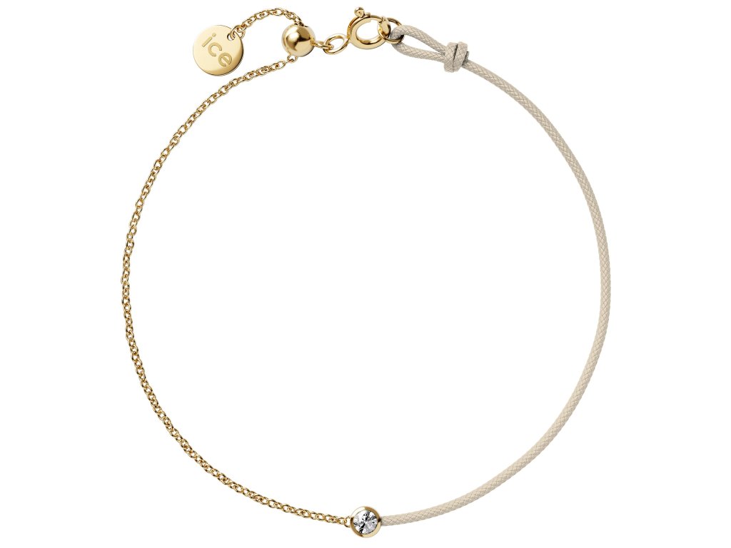 The bracelet combines a gold-coloured silver chain with a pleasant beige cotton cord. Thanks to its calm and natural look, it is suitable for wearing on its own or for delicate layering with other bracelets, chains or watches.