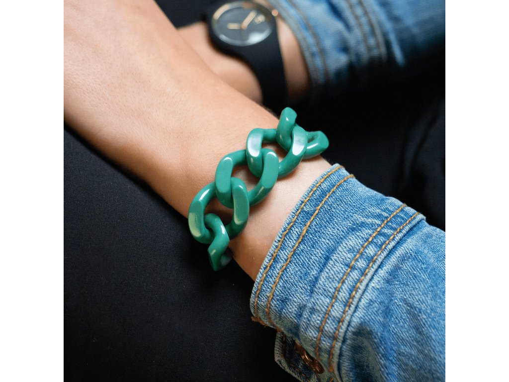 Green stylish bracelet in the look of a large chain with a carabiner clasp in gold.Additional parameters