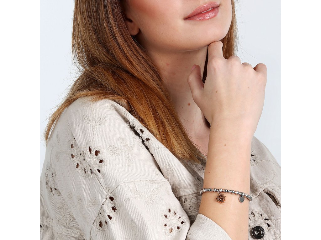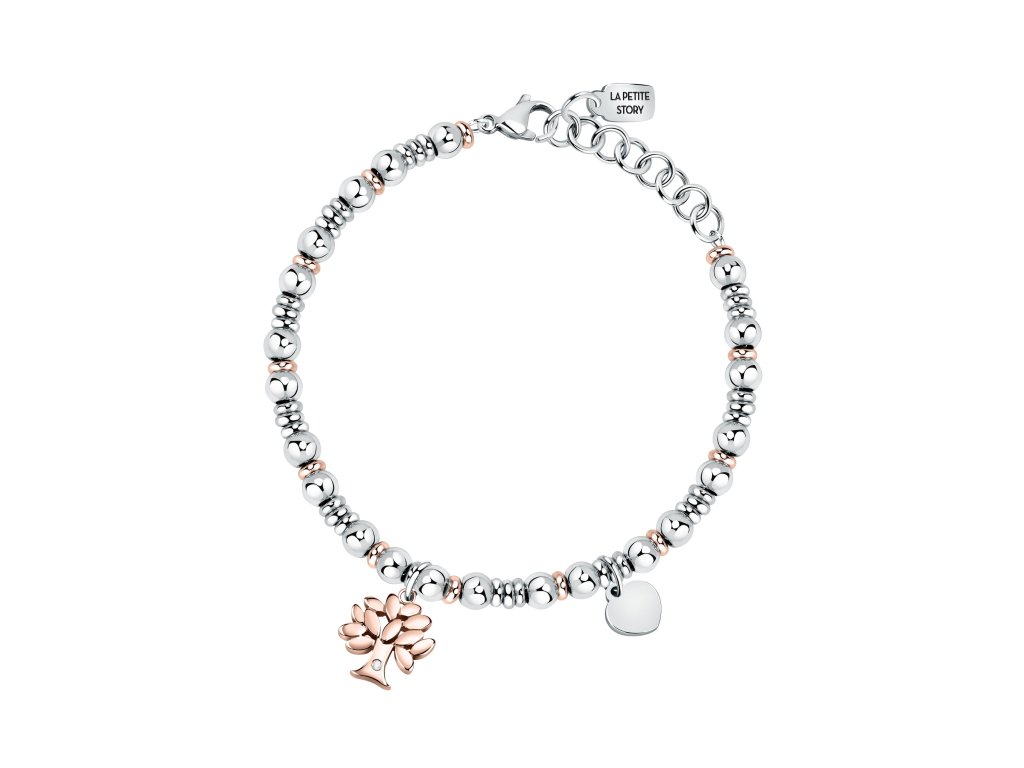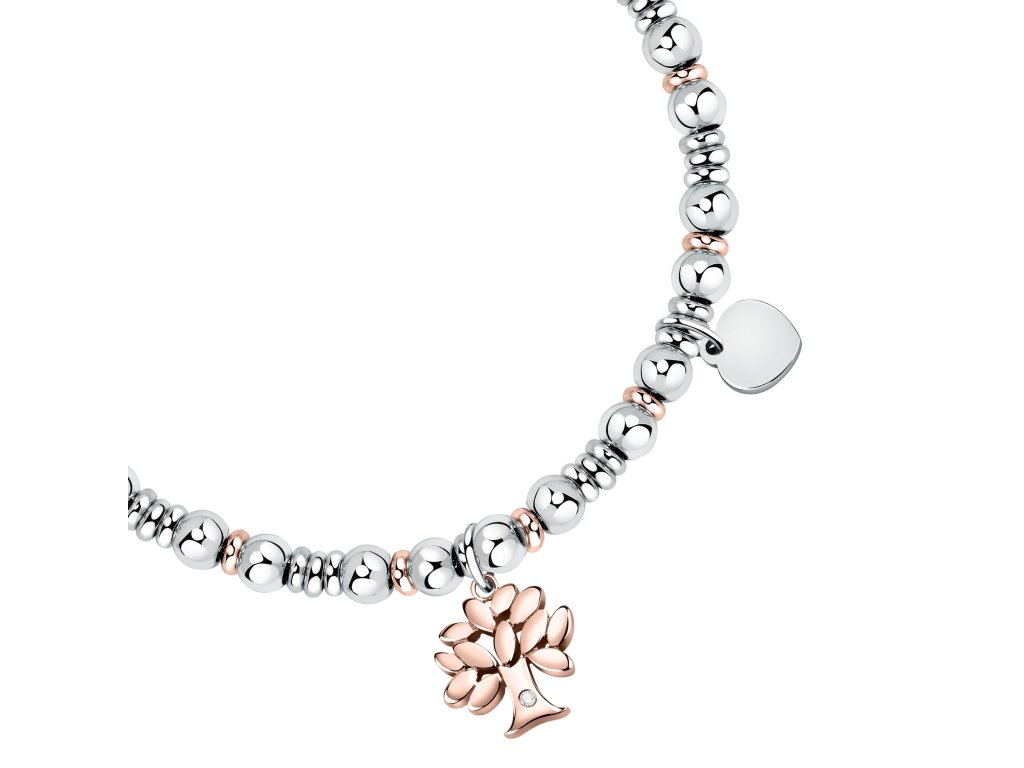 The bracelet is made up of several types of beads and is decorated with a tree-shaped pendant in rose gold with a crystal and a pendant in the shape of a tiny heart.