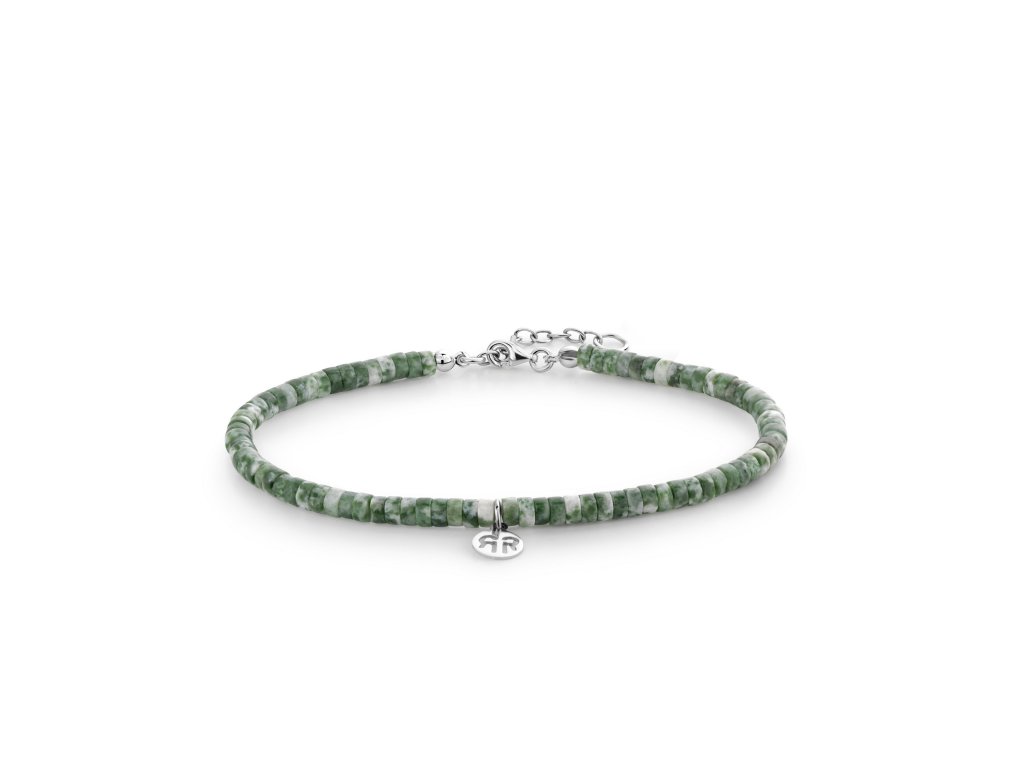 Women's anklet from the brand Rebel & Rose impresses with a harmonious combination of natural stone and delicate silver detail. The green tones of jasper appear fresh and balanced, making the anklet a natural complement to summer outfits, sandals, or bare feet. The minimalist pendant with the brand logo adds a subtle yet clearly recognizable accent to the piece.