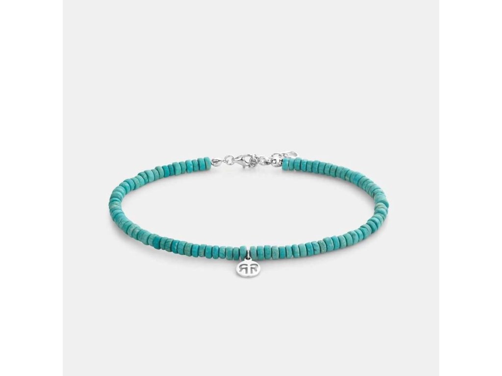 Women's Ankle Bracelet from Rebel & Rose Brings Lightness and Effortless Style Inspired by Summer and Freedom of Movement. Delicate turquoise beads create a clean and playful whole that will stand out beautifully on the ankle and naturally complement summer outfits, sandals, and bare feet. The silver pendant with the brand logo serves as a subtle yet clearly recognizable detail.