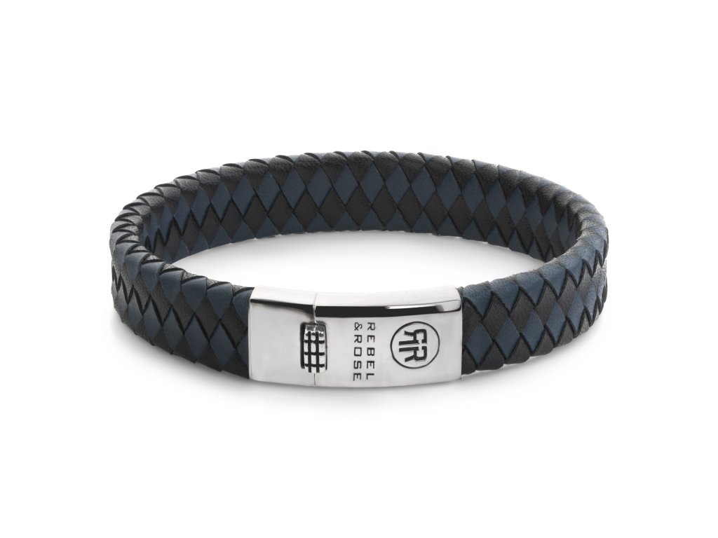The base is a blue and black leather strap with a flat braided design, ensuring comfort and visual depth. The whole is complemented by a decorative silver clasp, which provides a secure fastening and simultaneously underscores the iconic identity of the Rebel & Rose brand. Size L (20.5 cm) is ideal for larger men's wrists and offers comfort for all-day wear.
