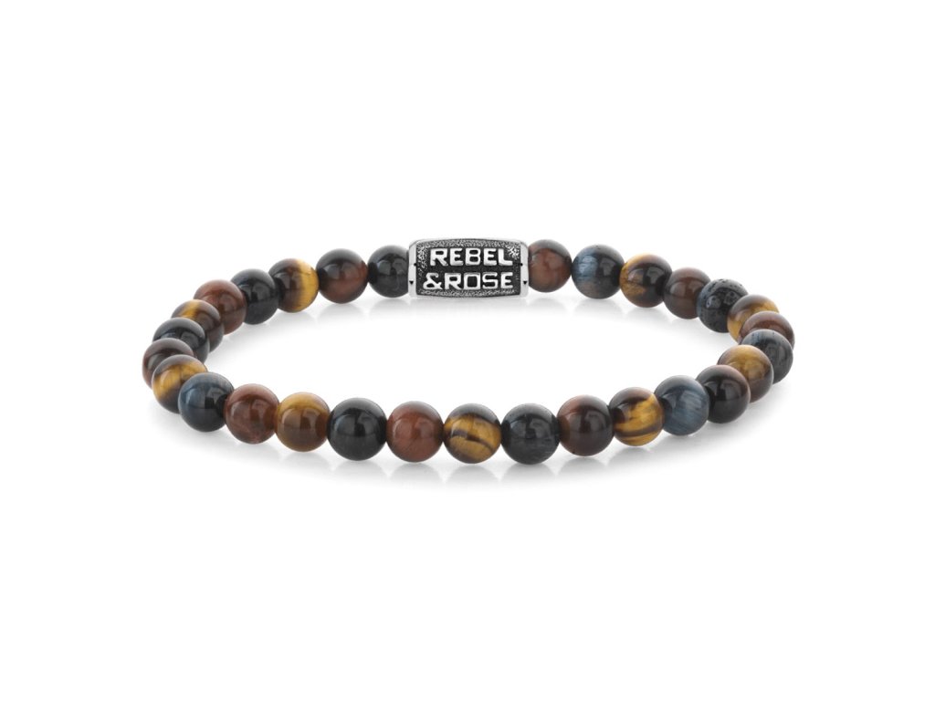 Unisex bracelet from the Rebel & Rose brand relies on the contrast of natural minerals and a clean metal detail that underscores its confident character. Regular tiger's eye beads create a balanced rhythm and give the bracelet natural depth, making it appear robust yet refined. The decorative silver-colored clasp discreetly closes the piece and maintains its minimalist expression.