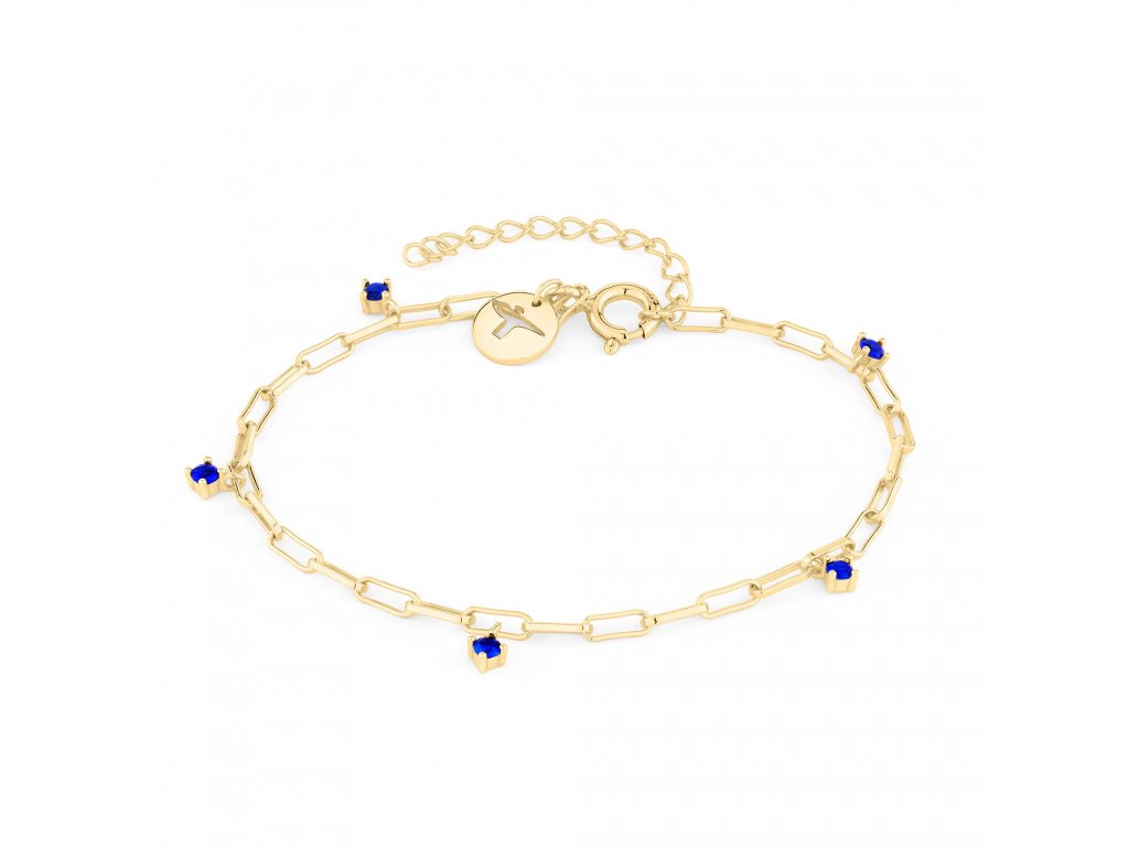The bracelet consists of a chain with larger eyelets on which five royal blue cubic zirconia crystals are suspended. Treat yourself to a touch of luxury and elegance whether at work, at a party or on a summer stroll.